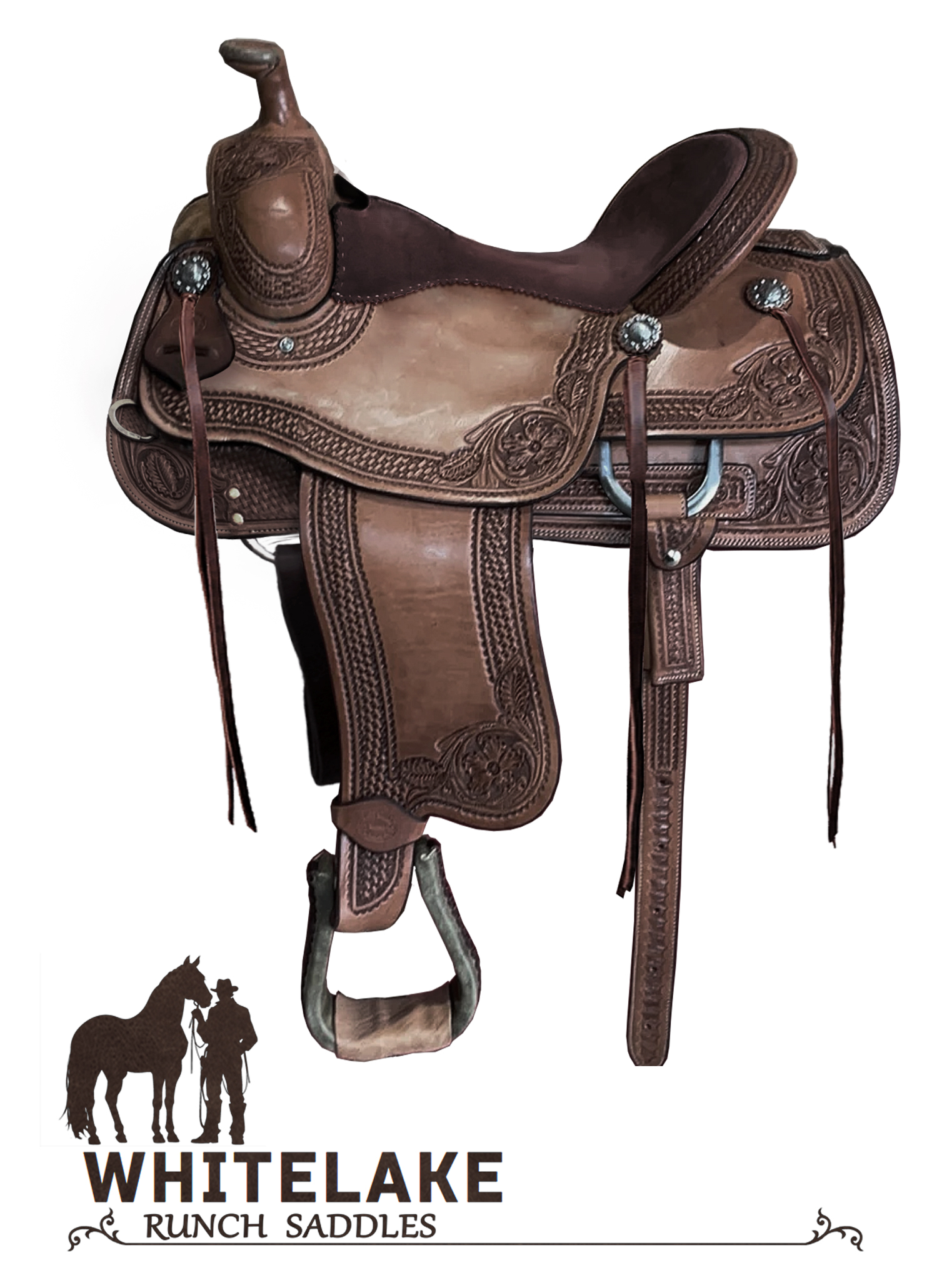 Седло для лошади с сидением из гладкой кожи. Большой рожок и вилка А формы. Украшено цветочным орнаментом по всему седлу. Стремена обтянуты сыромятной кожей. Задняя подпруга в комплекте.